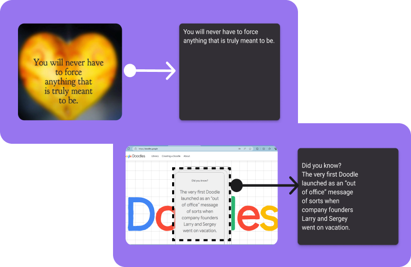 Upload an image from your computer or highlight an area with text in your browser and get the finished result!